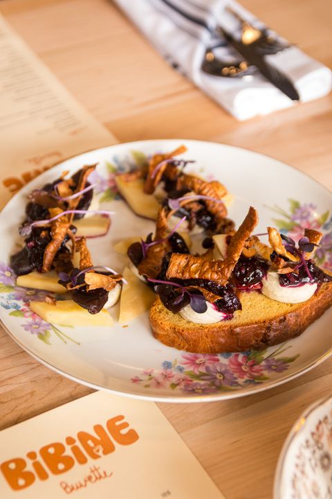 Bibine partage la philosophie de sa grande sœur, la table fermière Au Pâturage, dans une formule plus conviviale et accessible : un menu 100% local, avec des petites assiettes à partager qui mettent en vedette des produits de la région le plus possible. La majorité des légumes servis à la buvette proviennent d’ailleurs de la ferme du restaurant gastronomique, située tout près, à Sainte-Perpétue.