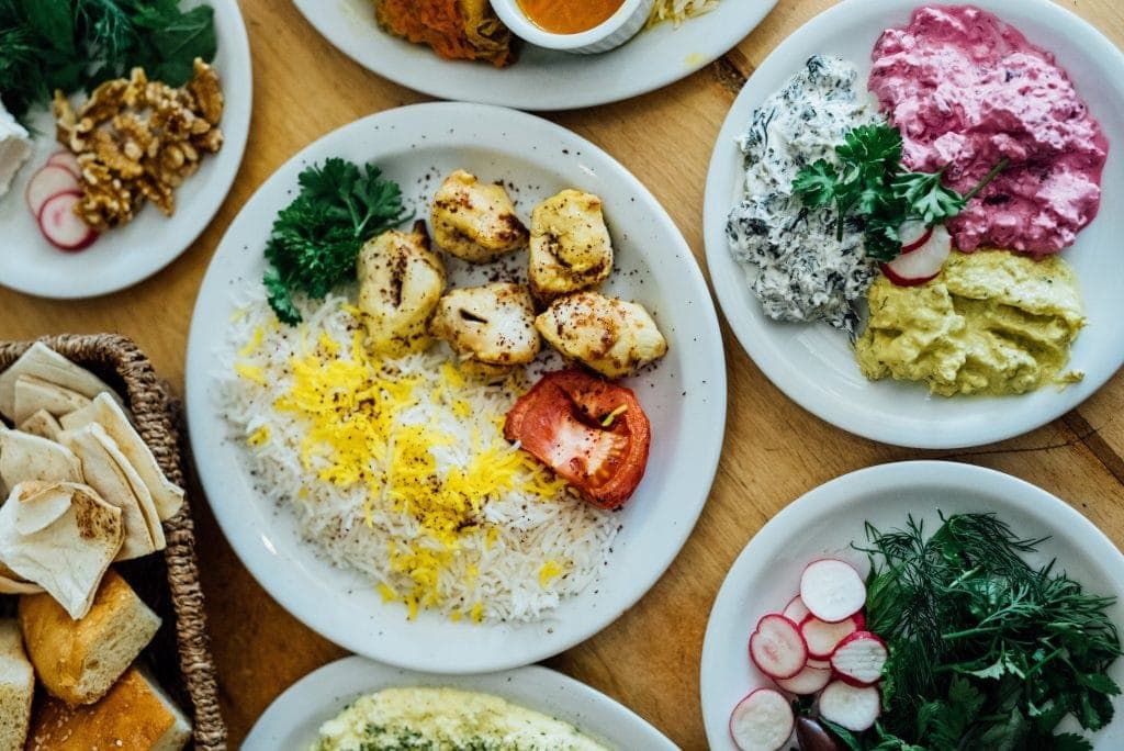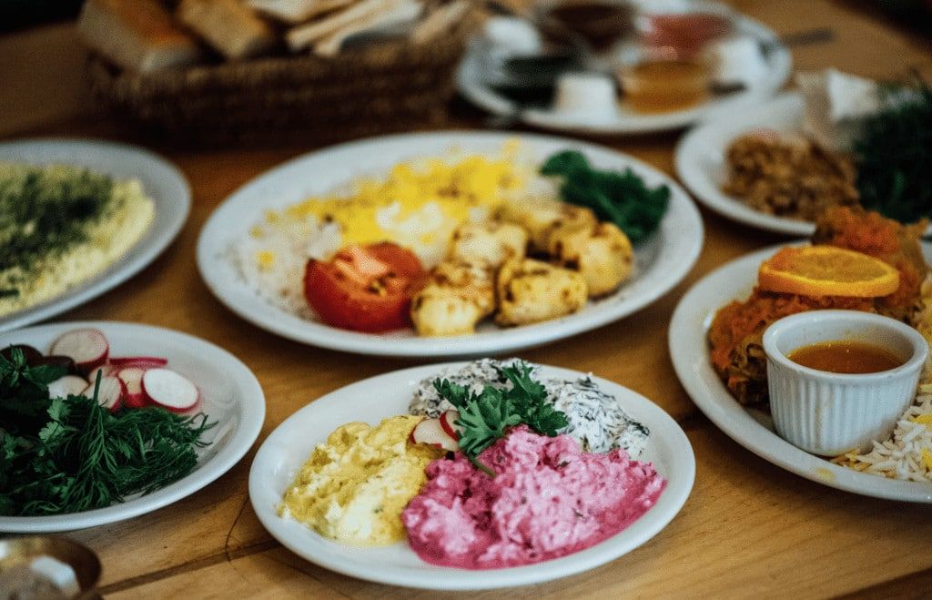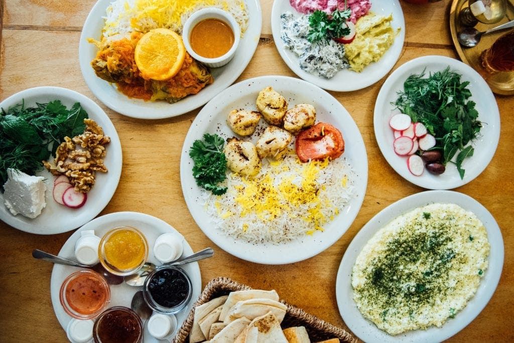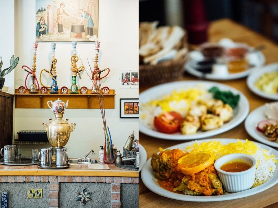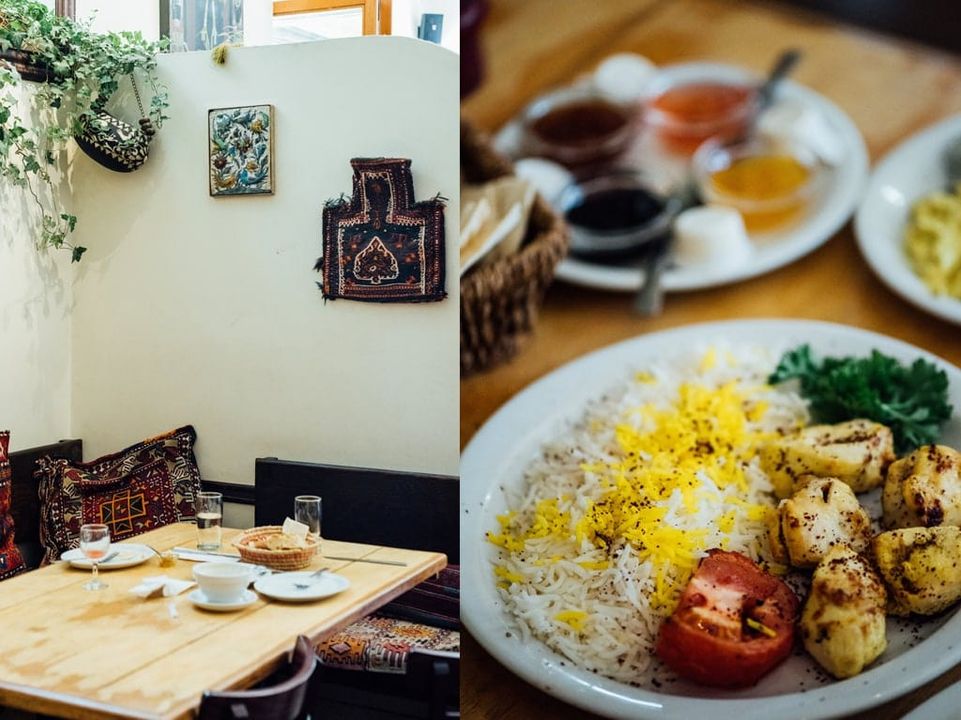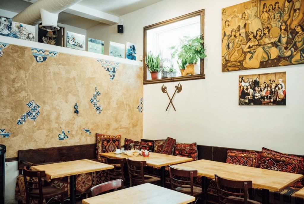 Le menu du Byblos est un menu de spécialités du Moyen-Orient, principalement de l’Iran. Ce dernier reste sensiblement toujours le même, mais on revient justement pour des coups de cœur inconditionnels. Nos préférés sont l’entrée de féta fines herbes — le meilleur féta en ville ! —, le dizzy — plat traditionnel iranien servi uniquement le dimanche soir — , les brochettes de poulet ou d’agneau et le poulet mijoté. On vient également depuis leur ouverture uniquement pour le petit-déjeuner aux saveurs iraniennes, dont l’excellente omelette au féta et ses nombreuses purées de légumes d’accompagnement disponibles. Tous les mets servis ici le sont de manière traditionnelle, avec leurs saveurs exotiques et tous les arômes et épices caractéristiques. Essayez également de terminer le repas avec un thé parfumé.