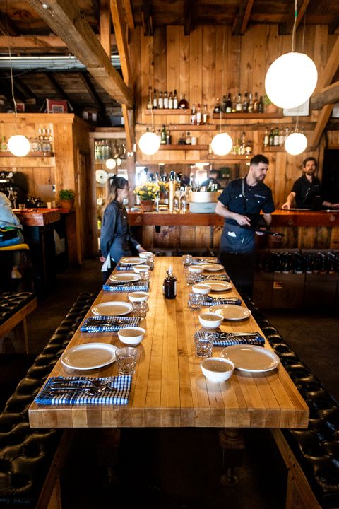 Un peu moins d’une centaine de convives peuvent prendre place aux tables communales dans la grande salle à manger en bois rond, au-dessus de laquelle trône une toile du peintre Marc Séguin. Trois tables VIP, dont une dans la cuisine, accueillent les amis et certains clients plus fortunés.