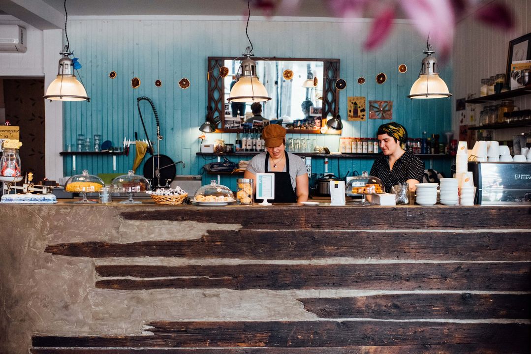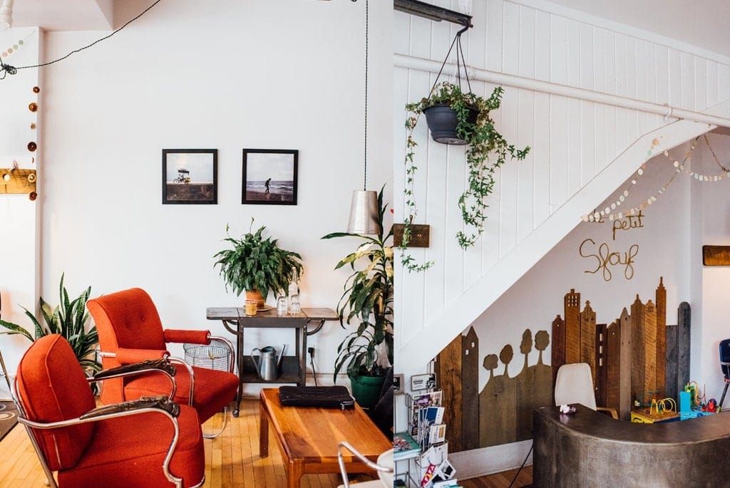 Si l’on vient ici pour se changer les idées, le café Sfouf attire aussi les amateurs de beaux établissements grâce à sa superbe lumière naturelle et son décor simple et coloré. L’établissement fait d’ailleurs partie de nos plus beaux cafés de Montréal. C’est Gaby, son copain menuisier Romain Servillat et son ami Patrick Thibault qui ont pensé et créé l’espace. On y trouve le fameux mur de verdure, le joli coin aux sofas rouges, le comptoir en bois au mur dégradé de bleu et les grandes fenêtres en portes de garage — qui s’ouvrent durant la belle saison pour plus de soleil encore! « C’est une bénédiction ce local, la lumière est extraordinaire. »
