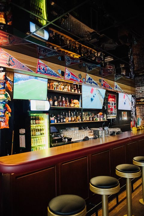 Le bar, aménagé en longueur, évoque le style des dive-bars, mais avec une touche définitivement plus raffinée. On y trouve des éléments nobles comme un long bar en bois, une immense banquette s’étendant sur toute sa longueur, un plafond réfléchissant, et des teintes sombres qui créent une ambiance festive et chaleureuse. Nous apprécions particulièrement l’utilisation de drapeaux, de photos, de maillots de hockey, de trophées d’équipes sportives, et de nombreux autres objets à l’effigie des Expos, du CH et du CF Montreal, ce qui en fait un lieu idéal pour les passionnés de sport. On vous recommande vivement de visiter leurs toilettes à la thématique unique, elles valent vraiment le détour! 😉