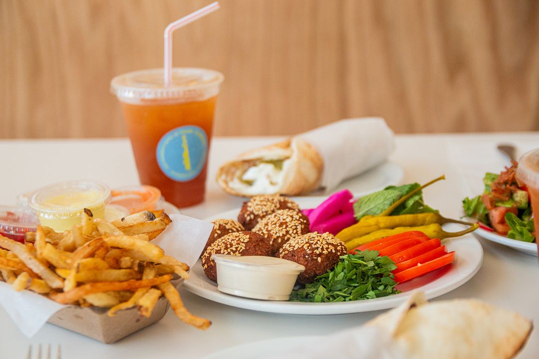 Pour les fans de falafel, vous allez adorer leur assiette vibrante et colorée – servie sans pita et donc 100 % sans gluten, et aussi dispo en version sandwich (celui-là, avec gluten !). Tout est préparé devant vous, et leur friteuse à falafel, avec son joli cylindre en cuivre importé de Tripoli orné de calligraphie, ajoute une petite touche théâtrale au spectacle.