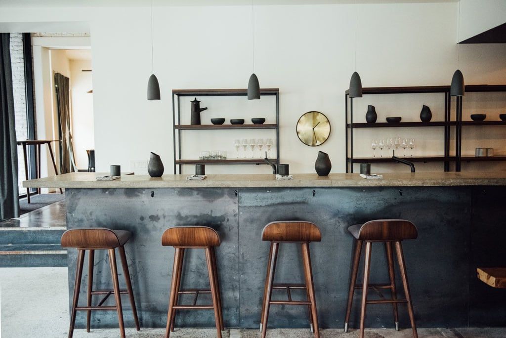 L’établissement a déménagé à la porte d’à côté de son ancien local. Le nouvel espace est plus chic, plus sobre et plus en harmonie avec la formule proposée. « On appelle ça à la blague le Mousso 2.0 à cause du Noma 2.0. » C’est Antonin et Katerine qui ont conçu l’espace de 30 places assises, dont huit au bar. Les superbes tables de bois, les chaises grises feutrées, le magnifique meuble “œuvre d’art;” tout est très élégant.