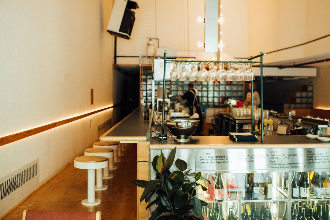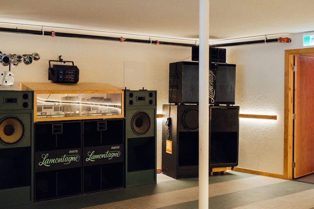 Sur le bar, platines vinyles, vins nature et petits bougeoirs complètent la mise en scène. L’ambiance, feutrée en début de soirée, s’intensifie progressivement au fil de la nuit. La fête se déplace vers la pièce à l’arrière, un dancefloor intime muni d’un imposant système de son s’anime. Comme on aime les histoires, notons au passage, que l’équipement sonore provient d’une ancienne disco mobile appelée Disco Lamontagne. Si seulement les enceintes pouvaient parler, elles en auraient des histoires à raconter!