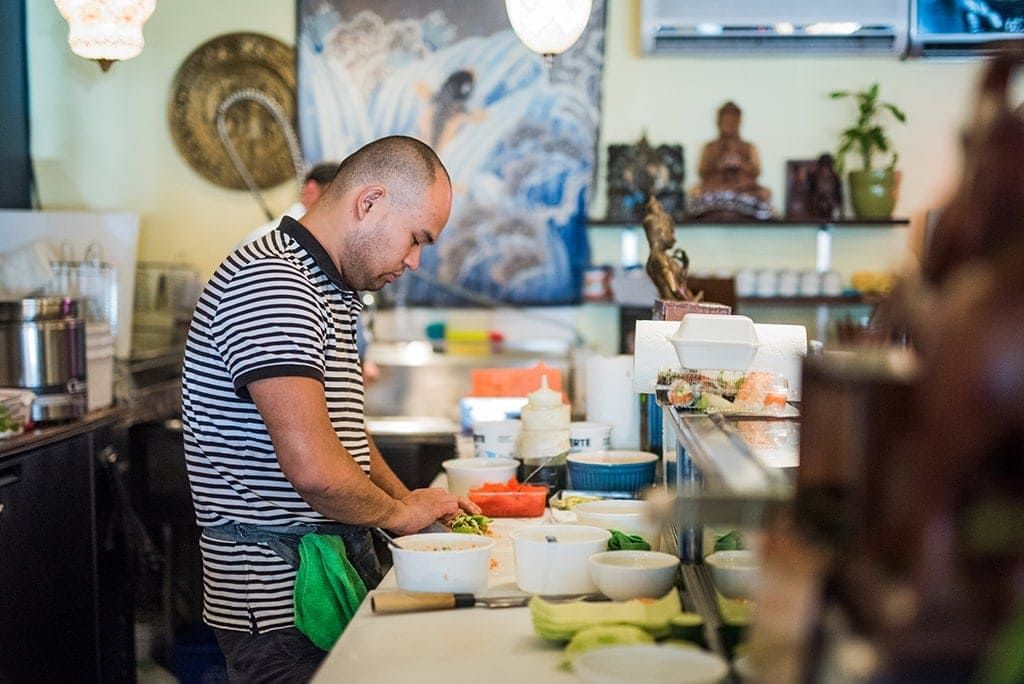 Le propriétaire de Saint Sushi, Saeng Outhipvongxay, a étudié en génie mécanique. Pour payer ses études, il travaille simultanément au Tri Express — un autre des meilleurs restaurants de sushis de Montréal. Il commence à la vaisselle, monte les échelons et finit par être sous-chef. « Je suis tombé en amour avec les sushis, avec le concept d’ouverture du restaurant, de rencontres de gens », nous dit-il.