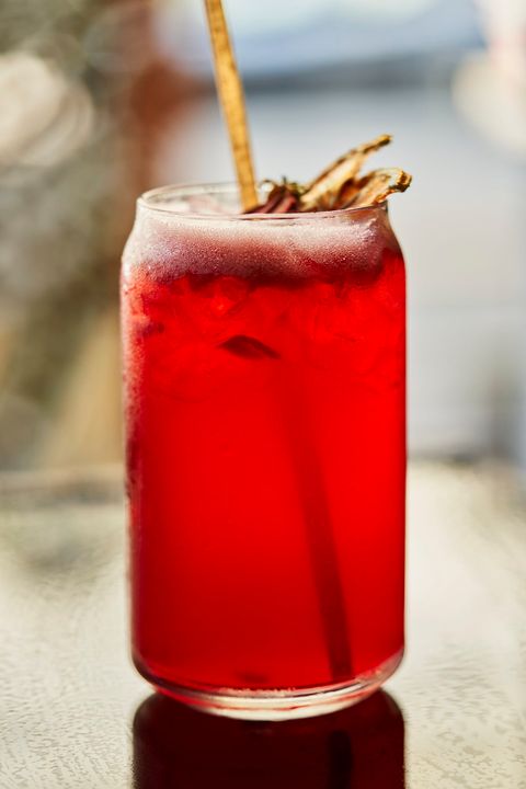 - Add the strawberry-hibiscus syrup and lemon juice to a shaker filled with ice cubes. Shake vigorously.