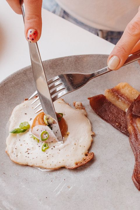 Ceviche de coeur de palmier et crevettes de soja Oeuf et bacon véganes Toast à l'avocat Kale César et falafel Yoni Bao, falafels Yoni et Baklava pancakes Frites de tofu Gnocchis Carbonara Bar à café Banquettes Entrée du local Le latté B12 à la spiruline bleue Boissons botaniques