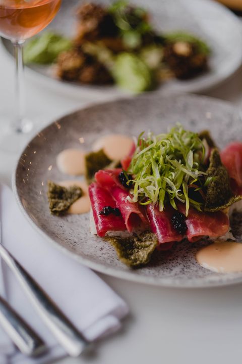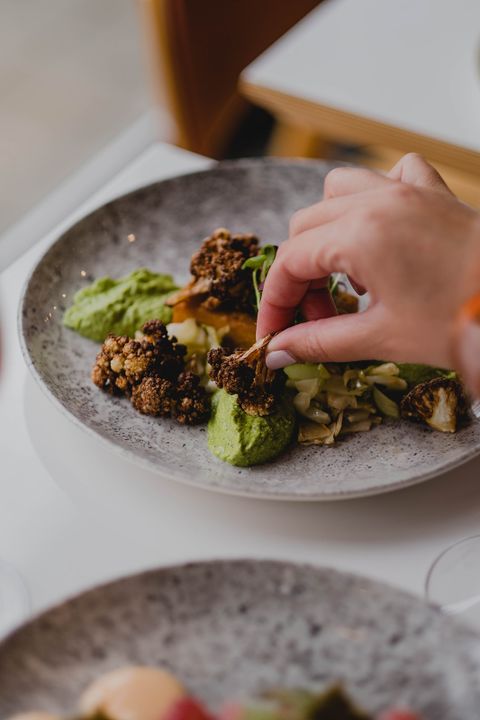 The sleek and modern design is by Marc-Antoine Coulombe. The idea was to create an airy space with bright white walls and ceilings, with bright colours near the floor to anchor it all. On closer inspection, the panels on the walls and ceiling conceal subtle lighting that bathes the space in soft light. This work of colour and contrast continues on the plate: with their beautiful and colourful dishes.