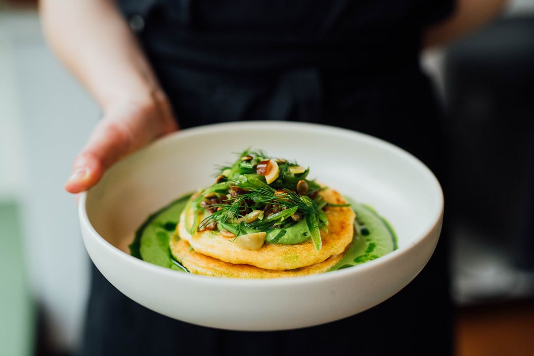 Despite what the name might suggest, this is not your typical snack bar. Instead, it’s the kind of place you go in the morning for a gourmet brunch, at lunch for a sandwich, or simply to study while sipping on a chai latte. The brunch menu features dishes with well-balanced flavors: poutine bravas, brioché érable (brioche with maple butter, orange caramel, and sumac), toast omelette (sourdough, egg, extra sharp cheddar, and spiced brown butter), Basque cheesecake, pain doré salé (savory French toast with brioche, smoked salmon, and goat cheese cream), and our personal favorite—the cornbread: a duo of corn pancakes with herb sauce, green olives, and pumpkin seeds.