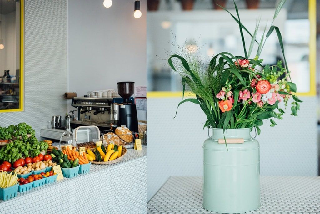 When you step inside Butterblume Épicerie, the familiar atmosphere greets you. The owners worked with the same designers, maintaining their impeccable taste. The space is bright, with white tiles and Butterblume’s signature yellow accents. Inside, you’ll find a large counter, a semi-open kitchen, a fridge stocked with select foods, and a small bench for a quick bite. Butterblume Épicerie serves as both a takeout counter and a mini-grocery store, offering fresh vegetables, herbs, and thoughtfully chosen small items by the owners.