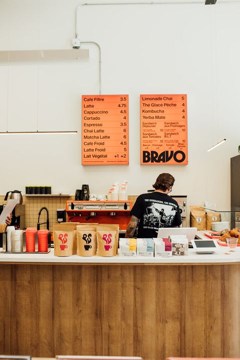 The address attracts both music lovers and specialty coffee lovers in their beautiful space. Designed by Marilou Langlois, the space is refined and highlighted with orange details. It is also possible to buy records, albums and accessories of the artists represented by the Bravo label.