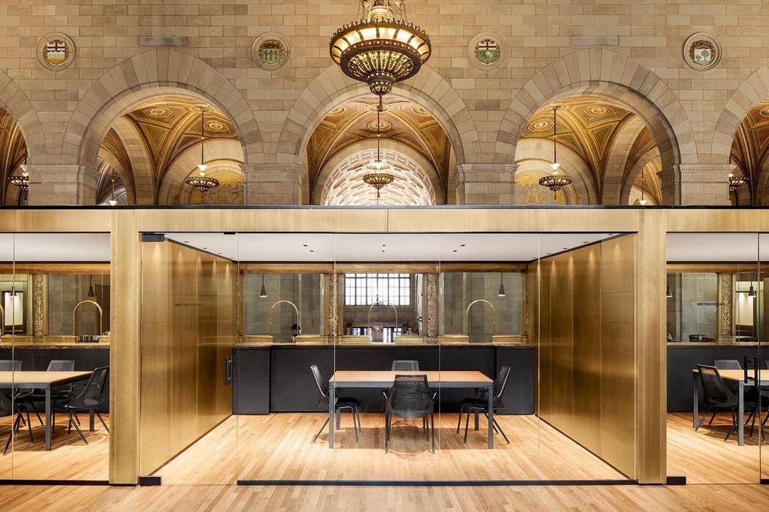 Testimony to another era, the building was built between 1926 and 1928 for the Royal Bank of Canada by the New York architect firm York & Sawyer. Many period elements of the building have been preserved by Crew Collective Café : a beautiful marble floor, a painted plaster ceiling decorated with brass light fixtures, as well as the teller’s wickets, also in brass. The café has been carefully renovated by the architect Henri Cleinge, with brilliantly integrated brass-plated steel boxes, private rooms that have been fitted with the former wickets and a beautiful marble counter where you can watch the food being prepared. The café has 100 seats and each workstation is equipped with all the pre-requisites and even a safety deposit box for your valuables.