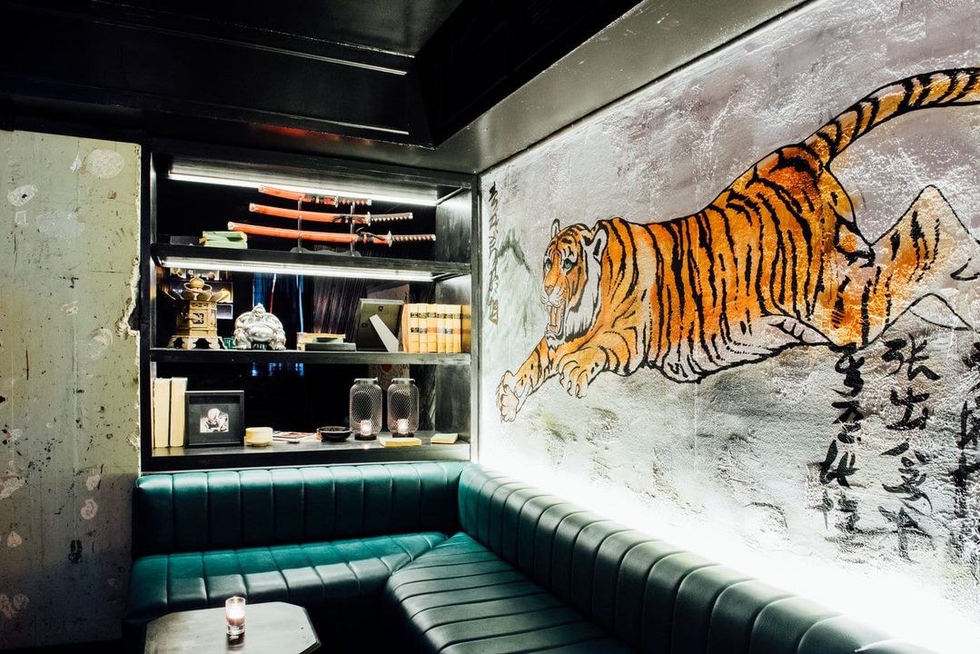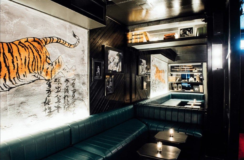 Only when you go through the black curtain in the middle of the small restaurant, do you enter enter the Japanese cocktail bar Gokudo. As in Japan, the change of atmosphere can take you by surprise and the design of the new bar is very attractive. The entire team thought out the seating plan for 45 over two small levels. The walls, parquet floor and ceiling are black. Almost every corner of the bar has a forest green leather bench, low tables and small candles. On the walls, a well-illuminated library filled with Asian items provides contrast, reinforcing the mysterious side. In the bar on the lower level, there is an aura of elegance and the area opposite has a mural of a large tiger. Everything is appealing, original, and transports you to Japan. This is now one of the most beautiful hidden bars in Montreal!