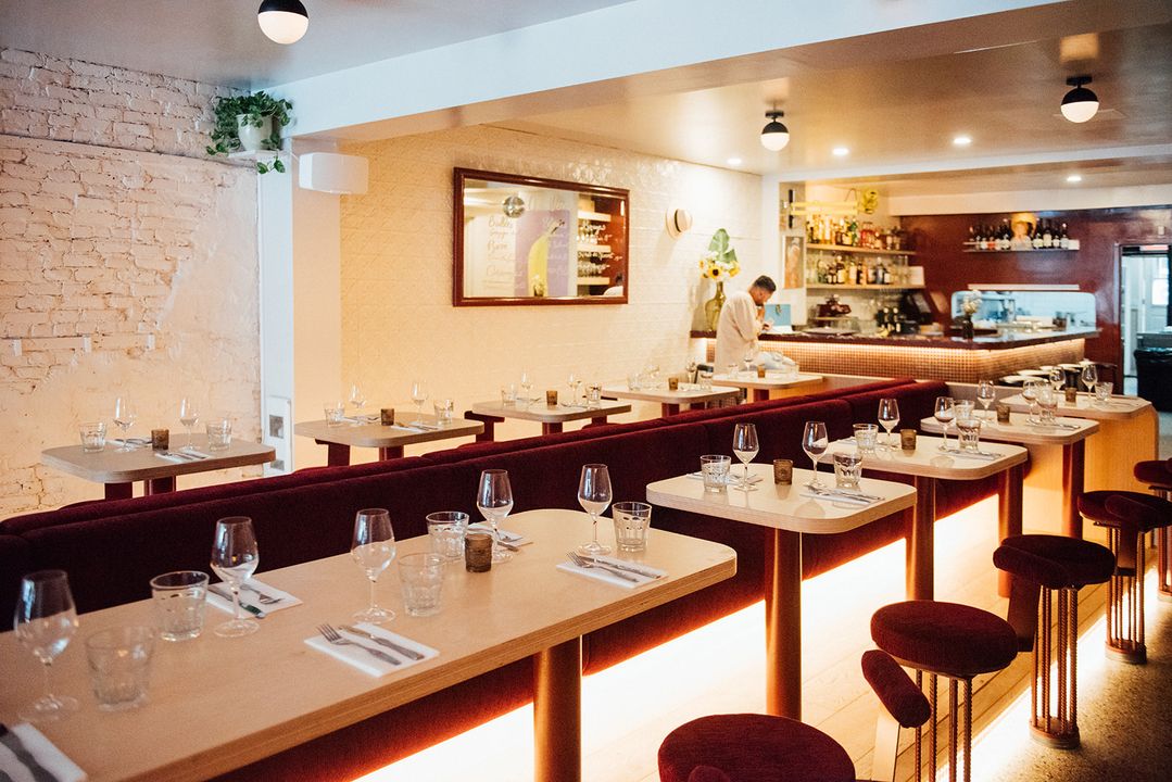 The design of June, conceptualised by Guillaume Ménard, is hushed and modern, but full of character. With long corduroy Burgundy banquettes that match the white oak of the tables, the space is warm and inviting.