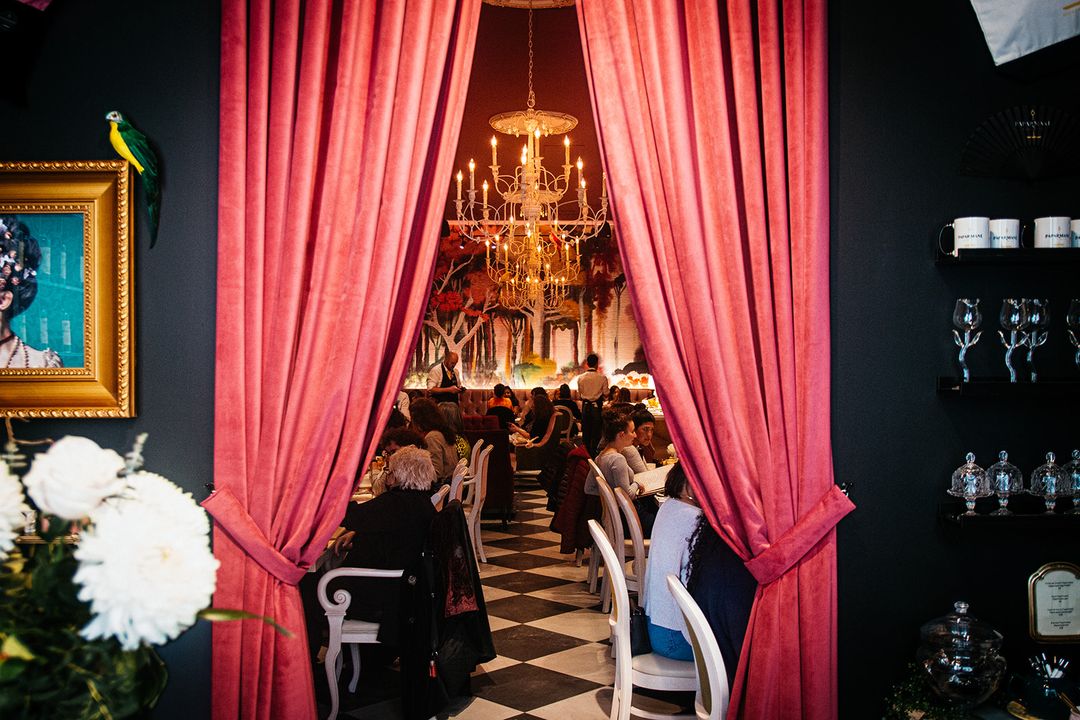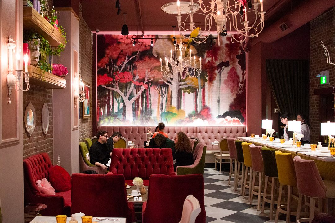Upon entering, guests are greeted by a small boutique section where they can purchase a selection of infusions, tea accessories, and gourmet products, including homemade pastries and pink “paparmanes” (old timey mint-flavoured candy, derived from the English word peppermint). Beyond the thick pink velvet curtains lies the magnificent tea salon with a cozy atmosphere, accommodating around fifty seats, including seven at the grand bar. Long pink velvet banquettes line two of the walls, while inviting tufted armchairs are arranged around low tables at the back of the room. It’s chic and quirky all at once.