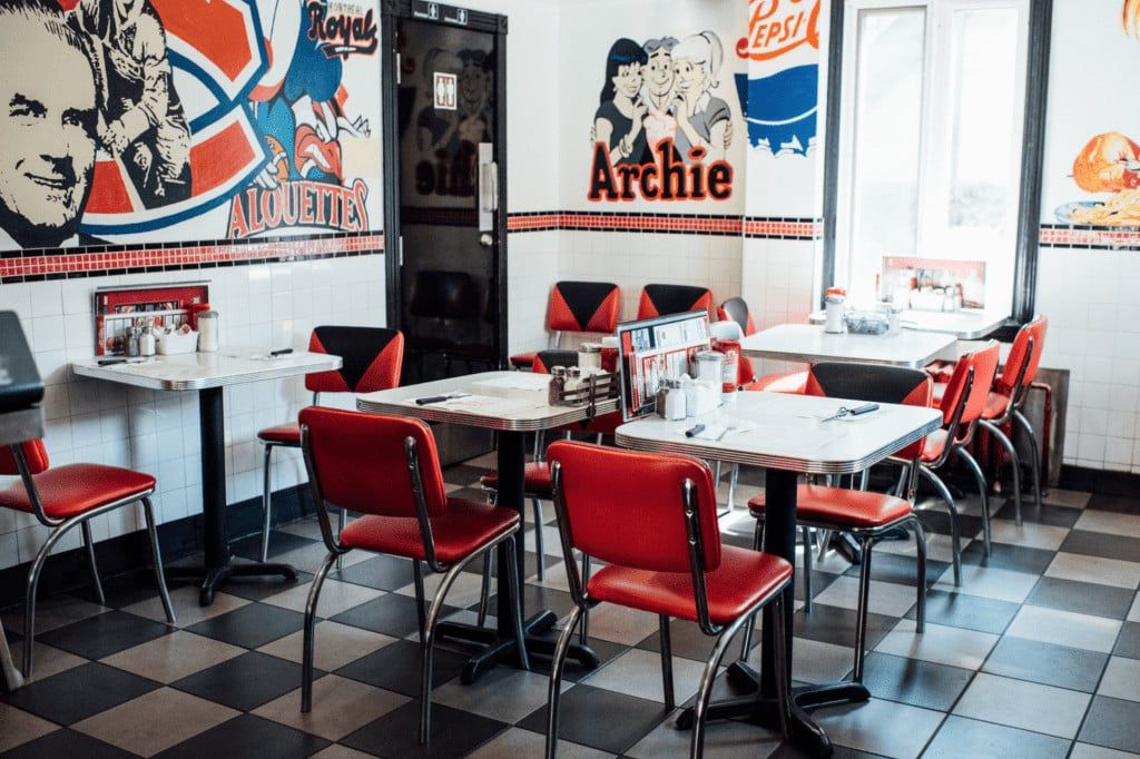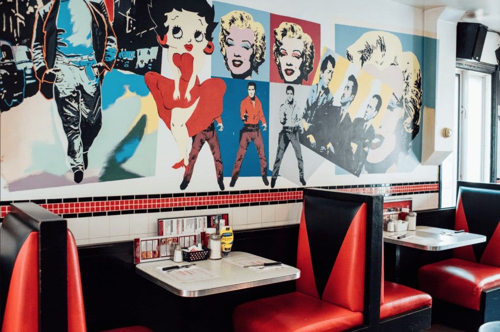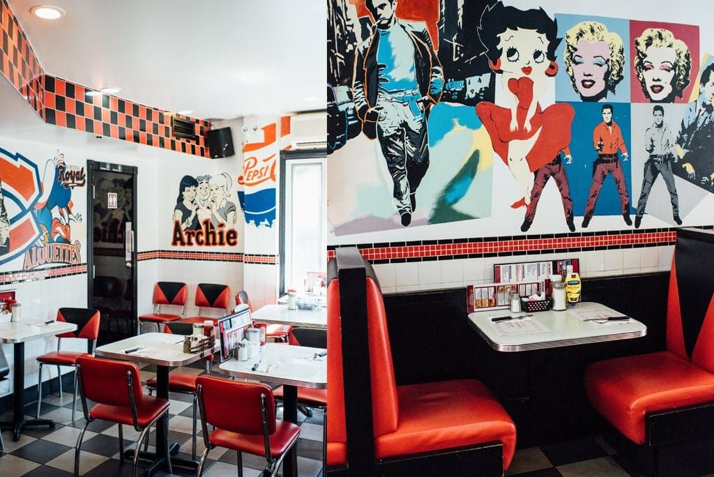 Opened in 1980, the restaurant bears the name of the original owners. Since 2003, it is Angelo Serfas, in the kitchen at Paulo et Suzanne. At first glance, the restaurant distinguishes itself by its “American Dinner” and “Rock and Roll” design. Paulo et Suzanne has the typical 1950’s American diner decor with a retro/vintage feel. Black and white tile floors, red leather chairs and classic Pop Art illustrations on the walls. The design was created by Angelo and a friend of his.