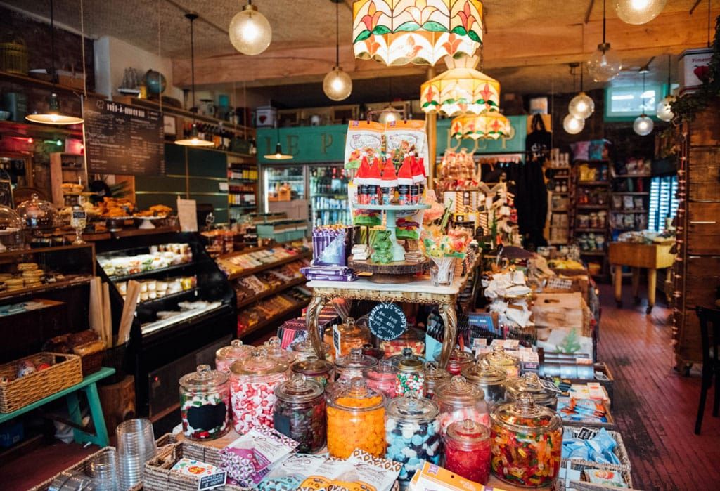 Le Petit Dep is quite incredible, thanks to Magda and it certainly exudes a lot of love! The storefront details allow us to feel that we could be in a small town somewhere in France. And once inside, having passed the charming soft turquoise-green exterior, it is difficult to know where to start – the eyes roam to the many vintage objects and the stained-glass hanging lamps, or up the shelves stacked to the rafters, down to the colourful candy and chocolate displays. The wooden floors offer a warm tone to the space as well. Several pieces of furniture and materials from the old convenience store have been restored and repurposed. The decor was the work of Thomas Csano with the help of Richard Holder (Majestique, Darling), as well as Magda. Together, they have succeeded in creating warm and enchanting surroundings!