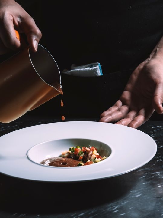 A gazpacho paired with a dazzling trio of shrimp, tarragon, and strawberry.