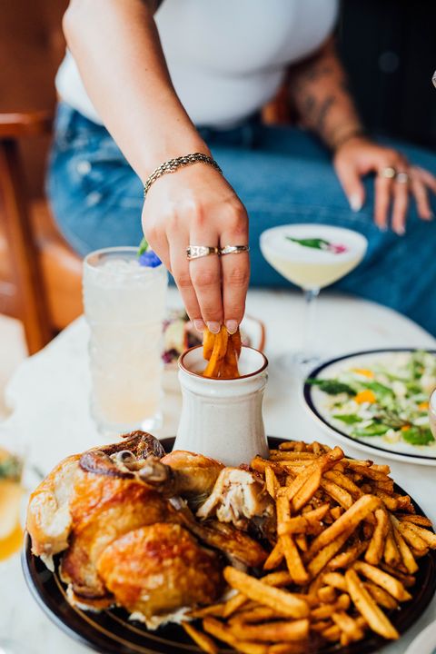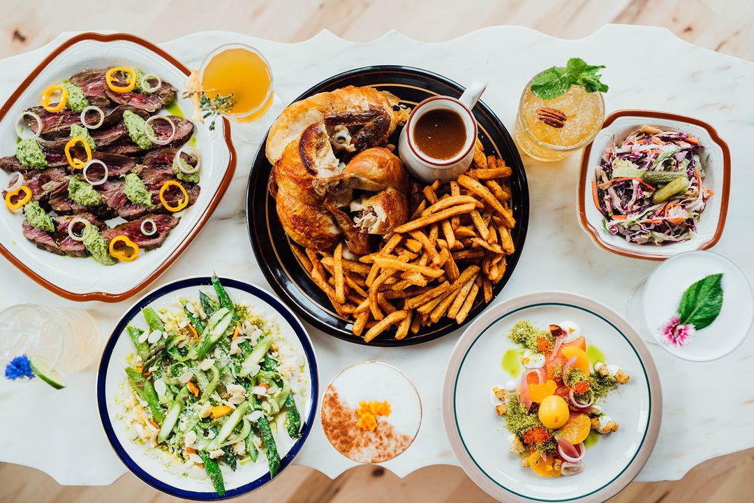 The menu, crafted by Nicolas Mara (formerly of Bungalow), strikes a perfect balance between indulgence, refinement, and generosity. Expect oysters, a rotating seafood platter, and shareable starters like honey-glazed chicken wings, smoked gazpacho, smoked trout, Caesar salad, heirloom tomatoes with nectarines, and a silky chicken liver mousse. As for mains, the fall-off-the-bone ribs—slow-cooked in their smoker—are an absolute treat. The smoked flank steak, served with a bright, herbaceous chimichurri, is equally impressive. And of course, the rotisserie chicken—available whole or half—comes with coleslaw, fries or salad, and their signature brown gravy: rich, flavorful, and downright irresistible. We had to hold ourselves back from drinking it!