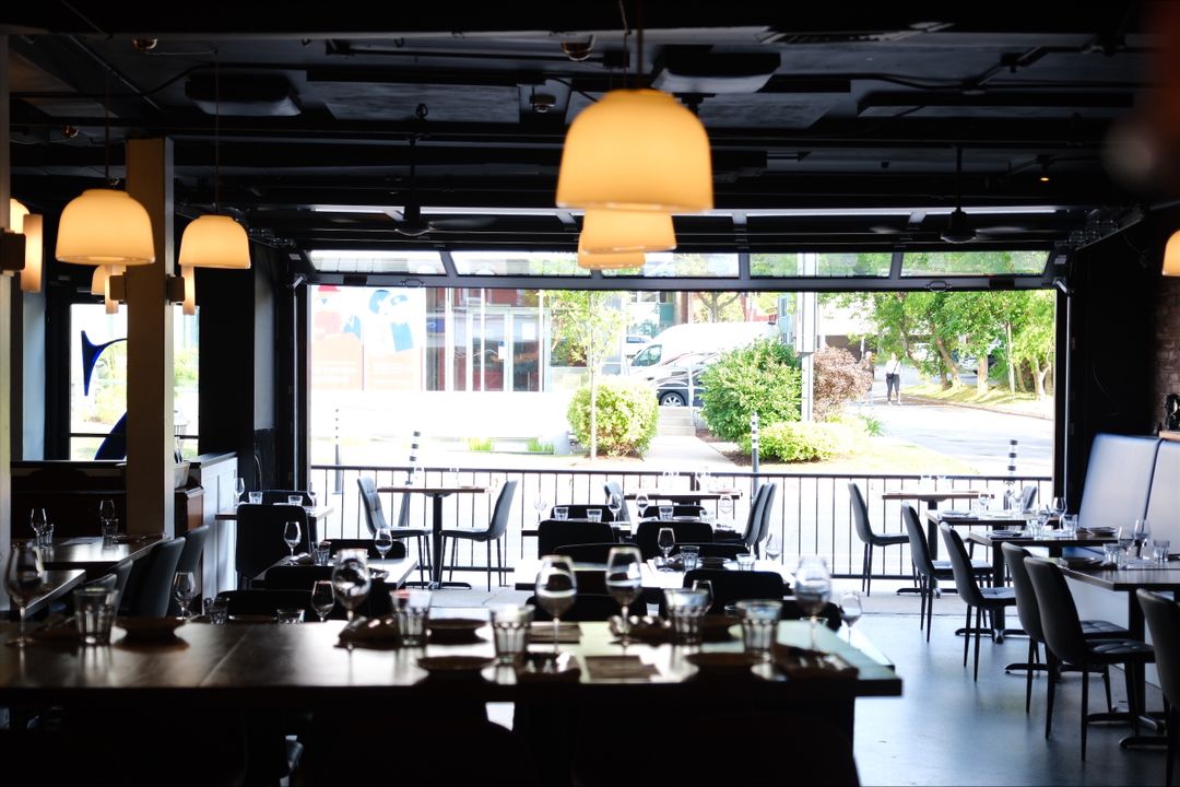 The décor is inviting: a massive garage door opens onto the terrace, extending the sunlit dining room. Inside, a black industrial-style ceiling dotted with light fixtures contrasts with white walls, while a long wooden bar structures the space. The overall effect is cozy, refined, and pretty — a polished yet unpretentious atmosphere where one immediately feels at ease.