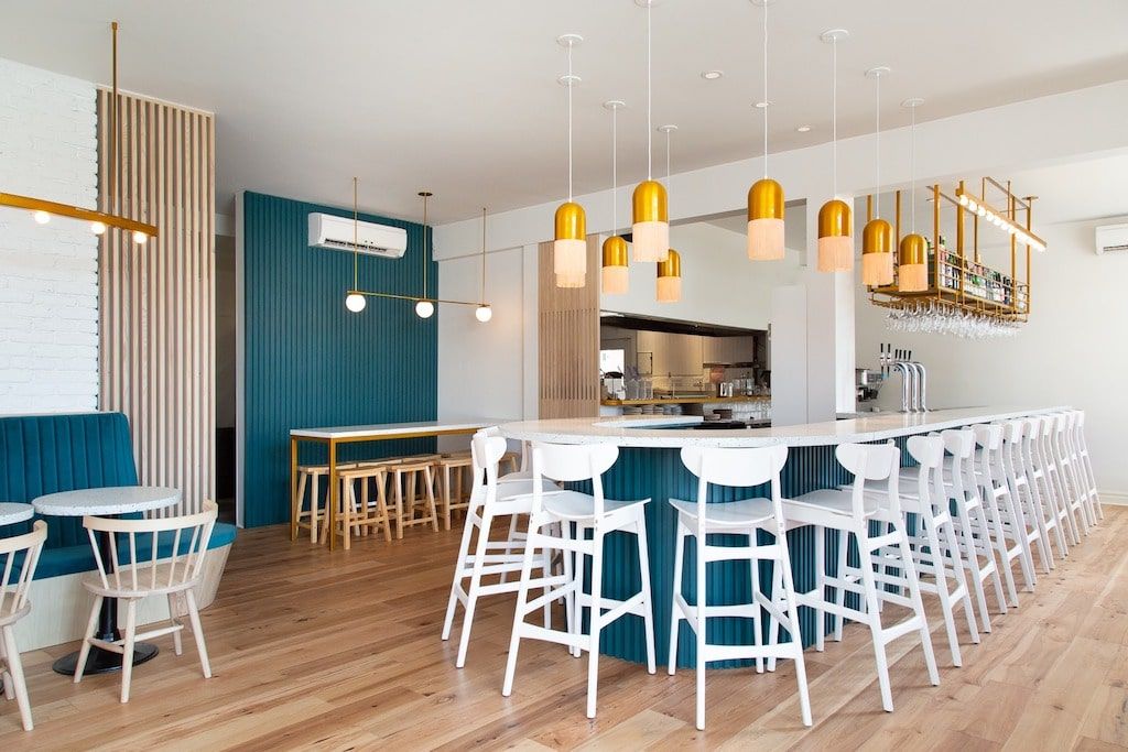 The bright and beautiful space—awash in natural light during the day—seats 56. In the summer, their patio seats 22. In the beautiful long room, the decor features the predominant colours of duck blue and white, with wood accents.