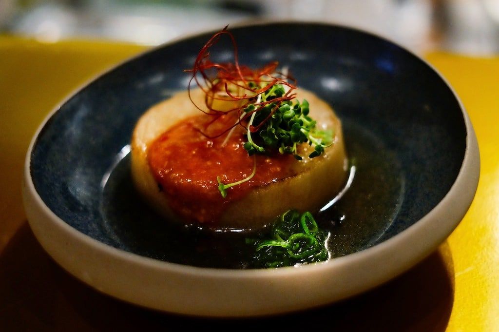 Inspired by his years in Japan, Cédric Charron’s menu features classic Japanese dishes—but vegan— prepared with local products. The lunch menu caters to quick lunch breaks for the surrounding offices. From 11:30 am onwards, we enjoy very good ramen (among the best in Montreal), tsukemens (cold noodles served with a broth on the side), and small plates to share: cold eggplant agebitashi and shiso, wakame salad, and silky tofu agedashi and plum ume.