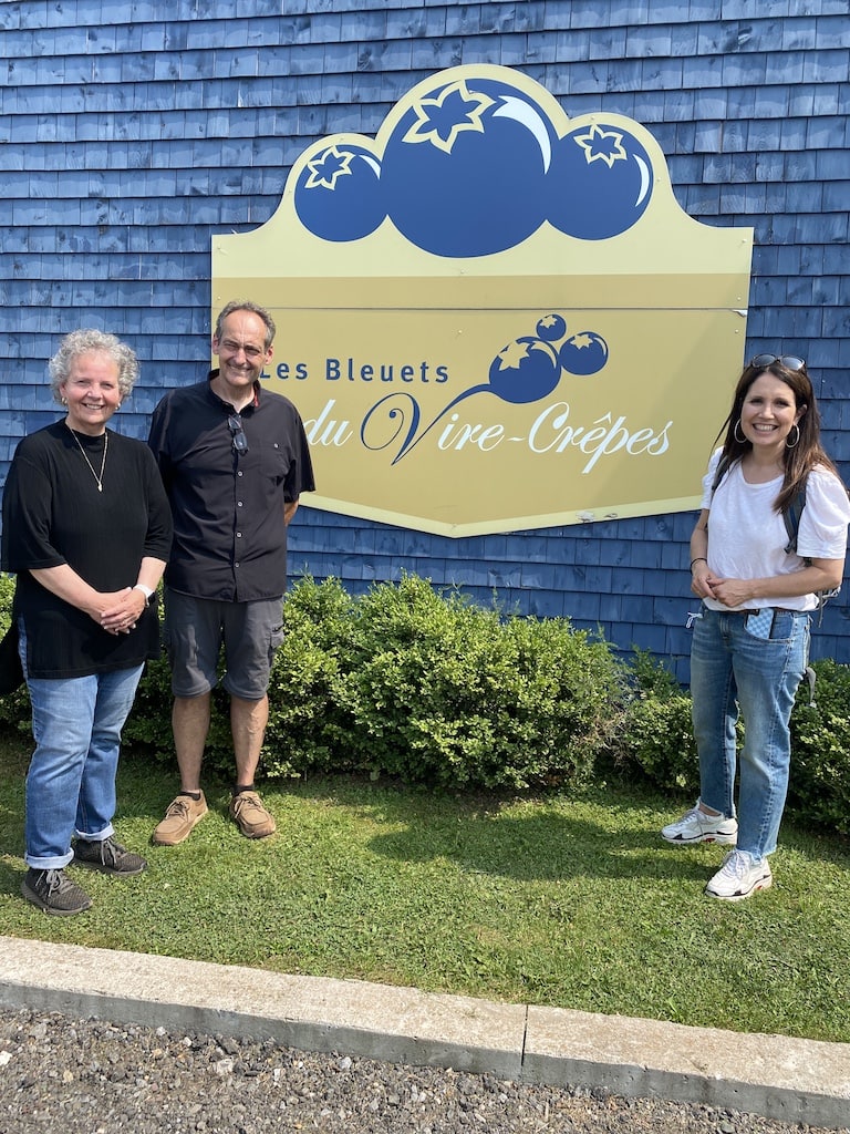 Nous nous arrêtons sur le site enchanteur des Bleuets du Vire-Crêpes pour le dîner. Une table de beaux bleuets installée à l’entrée de l’espace-boutique, et à côté, les propriétaires, Anne Ladouceur et Alain Soulard,attendent l’ambassadrice impatiemment.