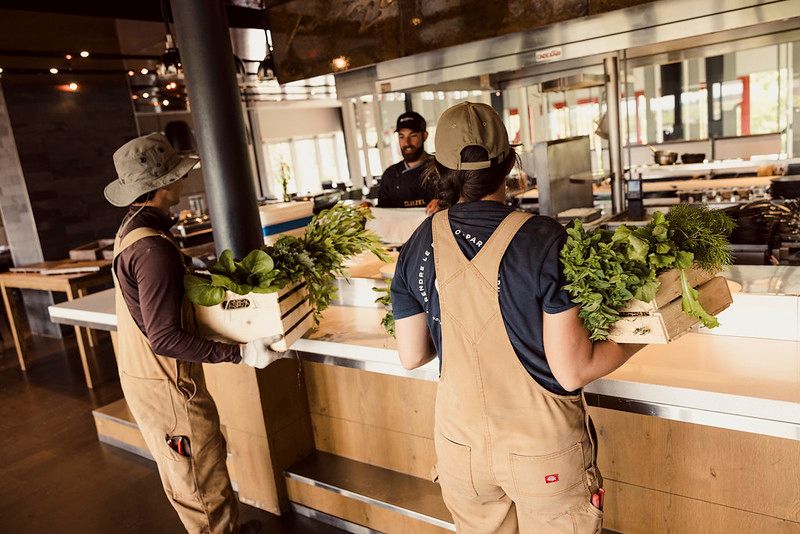 Il existe en effet une véritable symbiose entre les cuisiniers — notamment le chef Patrick Dubé épaulé par Benoît Larochelle — et les jardiniers qui sont en permanence en lien avec les premiers. Au fil des saisons, les récoltes sont méticuleusement planifiées en tenant compte des envies du chef et de ses besoins pour la carte. Méticuleusement, car les jardiniers maraîchers — Valère Sabatier, un tahitien tombé en amour avec la région il y a quelques années qui dirige les opérations dans le vaste jardin avec le soutien indéfectible de Stéphanie, Lisa-Marie et Virginie, toutes trois passionnées charlevoisiennes — veillent à limiter le plus possible la surproduction éliminant en cela tout gaspillage.