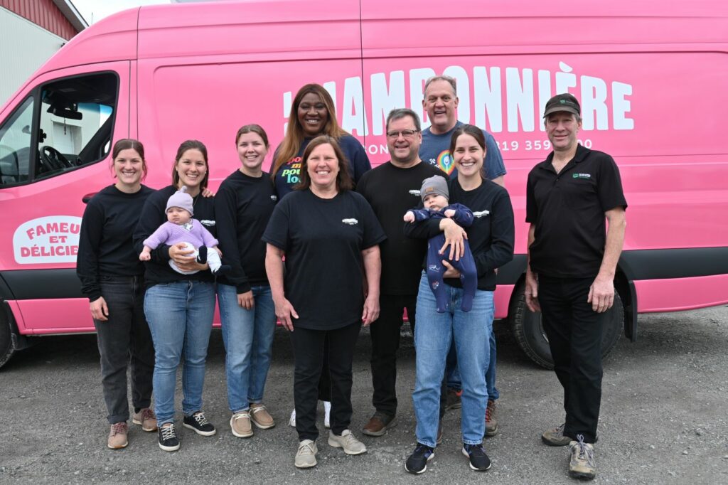 Premier arrêt : Saint-Rémi-de-Tingwick. Mélissa y a fait la rencontre d’une « famille tissée serrée » : Marc Couture et Lyne Groleau, proprios de La Jambonnière, et quatre de leurs filles (ils en ont cinq !). Les sœurs Couture sont bien parties pour reprendre l’entreprise familiale, qui élève plus de 1000 porcs et les transforme en de multiples cochonnailles. « Elles apportent vraiment un vent de changement à la porcherie. J’ai aimé voir à quel point elles prennent soin de leurs animaux », observe Mélissa, qui a elle-même trois filles de quatre, huit et treize ans. Elle leur a d’ailleurs rapporté de délicieux produits : creton, saucisson, pâté et terrine.