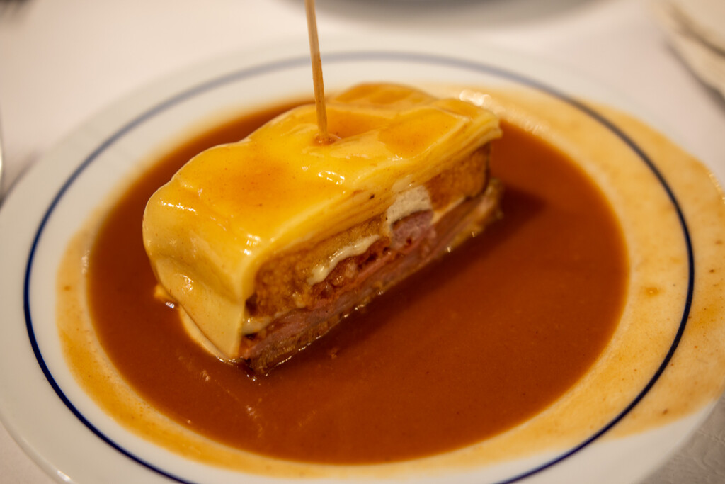 Sorte de croque-monsieur à la viande nappé d’une sauce épicée à la bière, la francesinha est à Porto ce que la poutine est au Québec. On ne pouvait séjourner dans la ville sans essayer son plat emblématique.