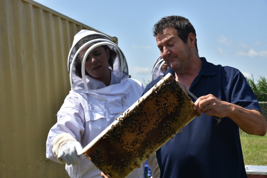 La journée a commencé sur une note festive avec un petit verre d’hydromel fortifié au whisky qu’Ali Agougou, le propriétaire de Miel Nature, à Beauharnois, a tenu à offrir à Marie-Eve. C’était peut-être une ruse pour la convaincre d’enfiler ensuite le costume d’apiculteur ! « Il m’a donné pour défi de trouver la reine, raconte Marie-Eve. La recherche n’a pas été très longue puisqu’elle était sur le premier cadre de la ruche. C’était quand même impressionnant ! »