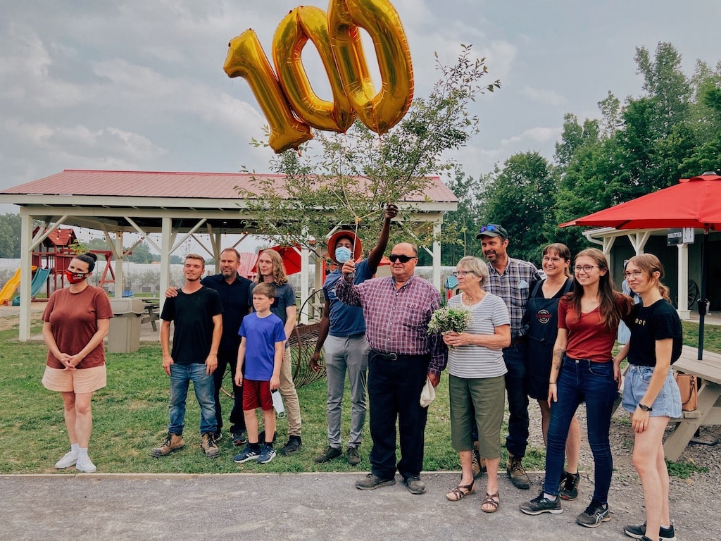 La tournée tirait déjà à sa fin, mais les festivités n’étaient pas terminées pour autant. À la Ferme Marineau, notre dernière destination de la journée, les célébrations étaient en effet de mise, puisque nous y avons souligné les 100 ans de l’entreprise familiale! C’est donc les bras chargés de ballons que Chef Paul a salué les membres de la famille Marineau, accompagné par la voix mélodieuse de Marie-Eve chantant un joyeux anniversaire bien mérité.