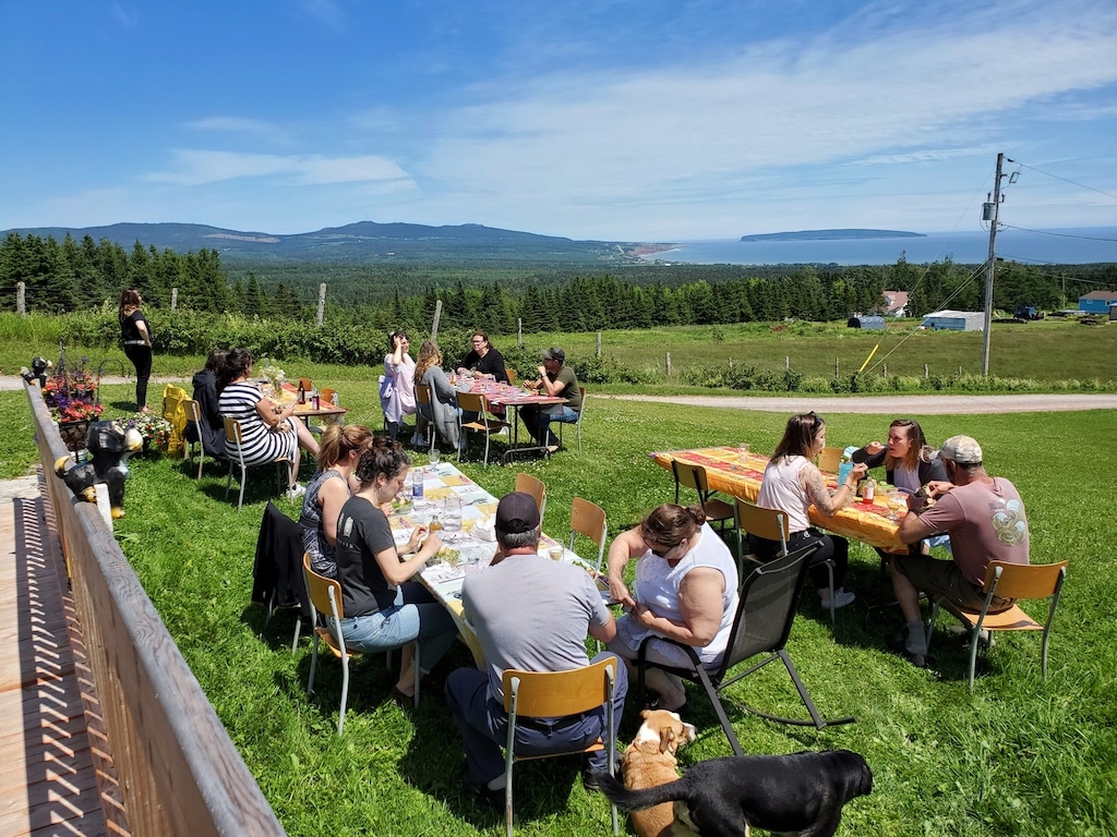 Stéphanie a mentionné que le saumon était différent et délicieux. On lui a expliqué qu’il était préparé en pavé plutôt qu’en tranches fines comme on est habitués à le déguster. La brise, le beau temps et la vue imprenable sur l’île Bonaventure venaient compléter cette pause. Mais à la fin, ce sont les vaches de Lorenzo et Bertrand qui ont volé la vedette quand elles sont sorties un peu plus bas. Tout le monde s’est levé pour aller les voir.