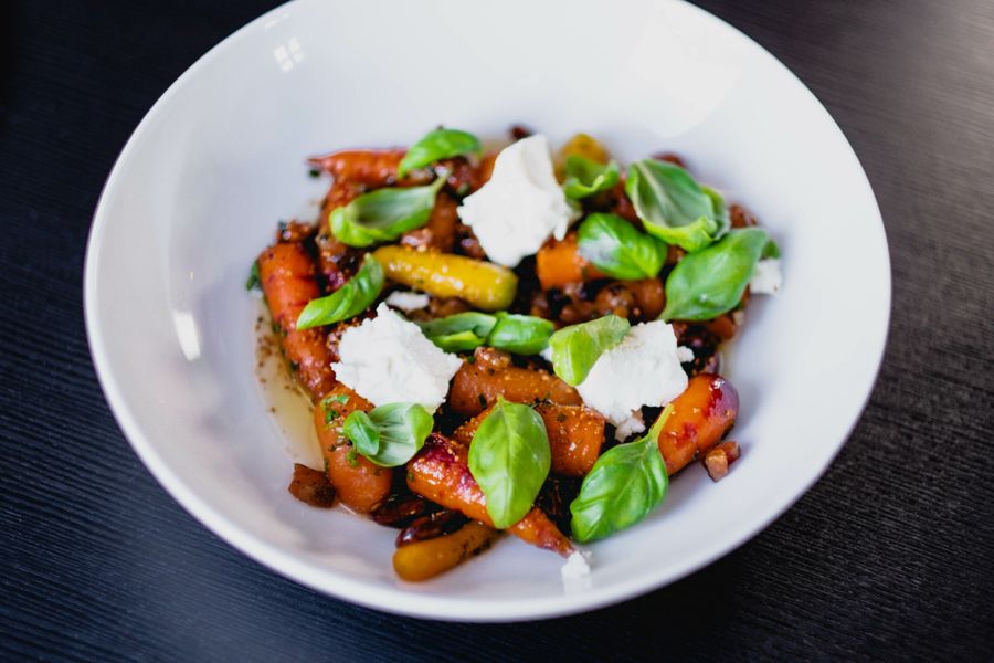 Carottes rôties avec bacon, chèvre et basilic du chef Pascal Turgeon du restaurant Tandem