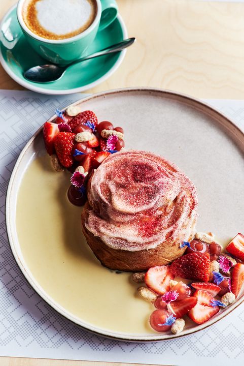 Côté sucré : Nos brioches à la compotée de rhubarbe et à l’érable, servie avec une crème au mélilot et des fraises de serre du Québec.